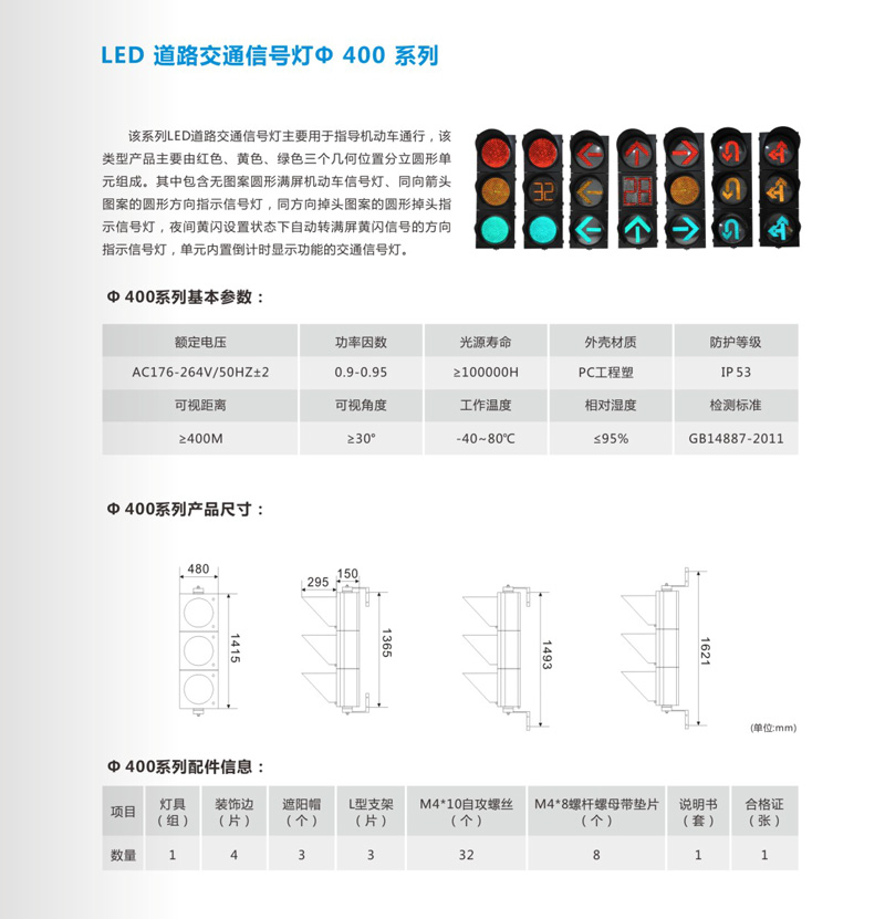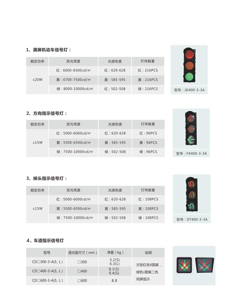 该系列LED道路交通信号灯主要用于指导机动车通行,该类型产品主要由红色、黄色、绿色三个几何位置分立圆形单元组成。其中包含无图案圆形满屏机动车信号灯、同向箭头图案的圆形方向指示信号灯,同方向掉头图案的圆形掉头指示信号灯,夜间黄闪设置状态下自动转满屏黄闪信号的方向指示信号灯,单元内置倒计时显示功能的交通信号灯。