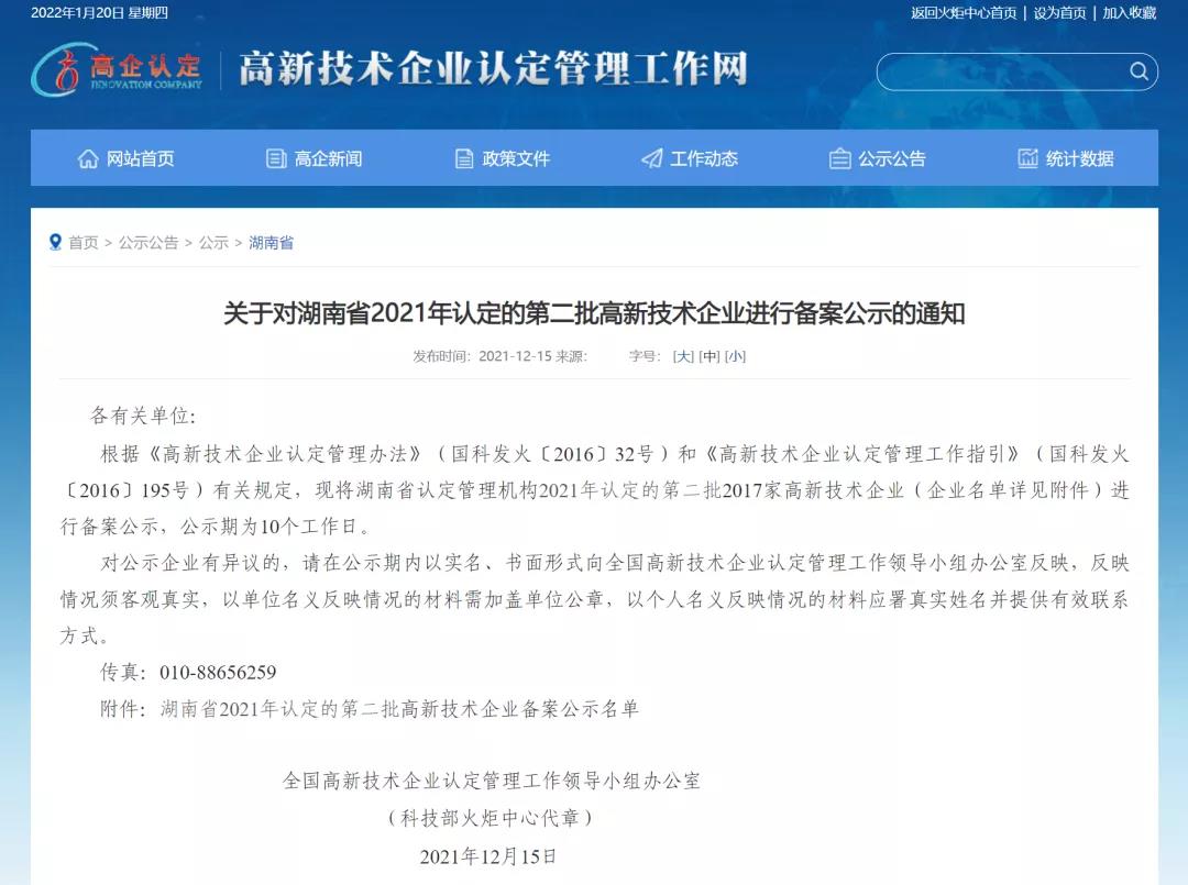近日,全国高新技术企业认定管理工作领导小组办公室下发《关于对湖南省2021年认定的第二批高新技术企业进行备案公示的通知》,2017家企业入围,我司列入公示单位,标志着我司正式迈入国家高新技术企业行列。