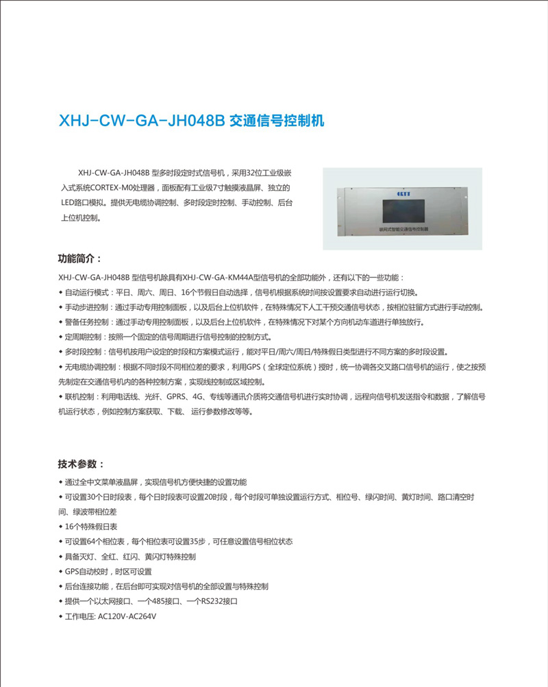 XHJ-CW-GA-JH048B型多时段定时式信号机,采用32位工业级嵌入式系统CORTEX-MO处理器,面板配有工业级7寸触摸液晶屏、独立的LED路口模拟。提供无电缆协调控制、多时段定时控制、手动控制、后台上位机控制。